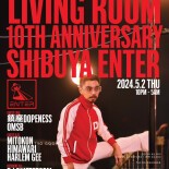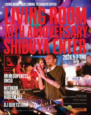 LIVING ROOM™ は2014年4月より池尻大橋Cave246から初まり、2014年秋に代官山Unice、2019年に渋谷contact、2023年より現在渋谷ENTERと毎月平日に開催され続け、2024年で10周年を迎える。今回は継続され続けたLIVING ROOM™のグッドミュージックバイブスを10周年ツアーと銘打ち全国10GOOD PLACEにDJ QUIETSTORMがお届けする。 現在レギュラー開催しているENTER SHIBUYAでは、まるで何かに憑依されたような奇妙なフロウでたちまちフロアを引き込む異才鎮座DOPENESSと、2023年10月〈SUMMIT〉よりミニアルバム「喜哀」をリリースし内面的なリアルが綴られたリリックでヒップホップラバーを虜にしているOMSBがゲストライブに登場。ゲストDJには南アフリカ音楽を中心としたコンテンポラリーアフリカンダンスミュージックを得意とする、アマピアノの魔術師mitokonと、CANNABISのディレクターとしてカウンターカルチャーのアイコンとして異彩を放ちながら、アブストラクトでポリリズムによる変則的なスタイルのDJで幅広いヴェニューで活躍するHIMAWARI、ヒップホップとエレクトロニックミュージックと共に育ち、DJに限定することなく活動の幅を広げるニューヨーク、ハーレム出身のHarlem Geeを迎える。