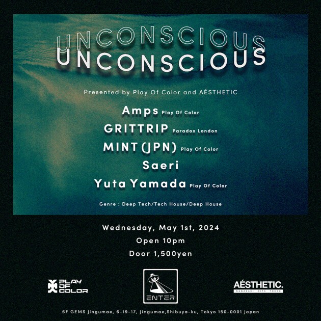 Amps、MINT(JPN)、Yuta Yamadaが主宰するディープテック/テックハウスレーベル〈Play Of Color 〉とGooPerが主宰するハウスパーティAÉSTHETICがタッグを組んだパーティUNCONSCIOUSが初開催。