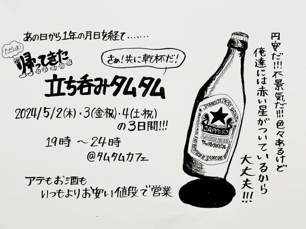 円安だ…不景気だ…色々あるけど俺達には赤い星がついているから大丈夫!GW期間中5月2日木曜〜4日土曜の3日間は常にやりたくてたまらない『立ち呑みタムタム』1年振りに開催!サッポロ赤星はじめ酒もアテもお手頃な立ち呑み価格◎普段とは違うタムタムカフェをお楽しみ下さい!飛び入りDJ大歓迎なので是非♪(5月2日木曜・3日金曜はsquareのイベントが急遽開催。2日間は投げ銭制です。)