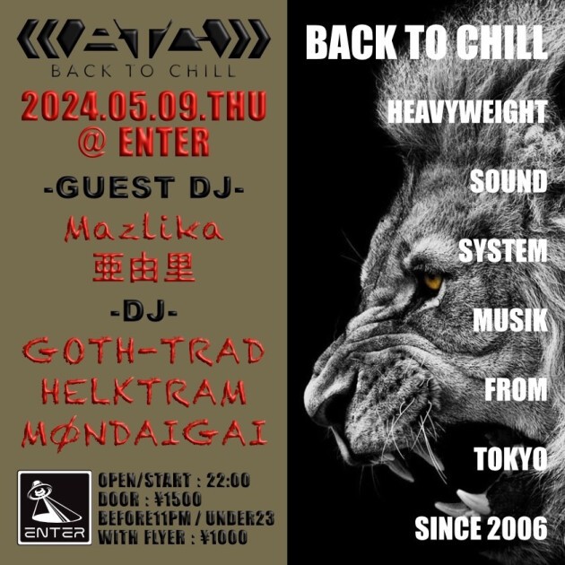 主宰GOTH-TRADがUKのダブステップ・シーンと繋がるきっかけとなった自身のタイトル「Back To Chill」を由来に、2006年に始動した同名のパーティは日本初のレギュラー・ダブステップ・パーティとして話題を呼び、国内のヘッズのみならず、海外のベース・ミュージック・ファンからも注目を集め、今やダブステップ/ベースミュージック・パーティの最高峰かつ代名詞にもなっている。ベースの唸りが床を震わせ、聴衆を低音の沼に引き入れる。体が震えるほどの重低音を体感できる贅沢な平日夜をぜひ体験してほしい。