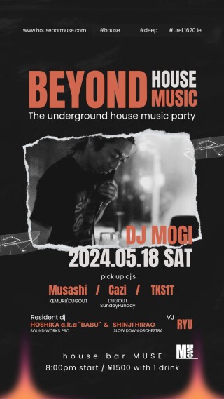 今回のBEYONDは3回目の出演となるDj MOGIをフィーチャリング。国内問わず、香港、韓国と勢力的に活動中。pick up djとして、大阪からはハウスダンサーでDjであるMUSASHI、ダンサーに人気のCaziが登場します。さらに東京都内で活動中のTKS1Tも登場!そしてフロアを彩るVJには人気のRYUを招集!是非!