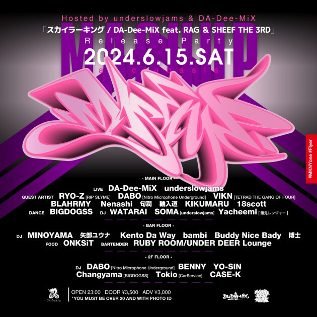6/12 (水)にMASHUPのホストを務めるDA-Dee-MiX・underslowjamsのRAGから声をかけられ招かれたBLAHMYのSHEEF THE 3RDにより制作された"スカイラーキング"がリリース。