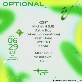 ASTRO BOY主催のOptionalの第3回目。EDGE HOUSEレジデントのプロデューサー/DJのKZMTと、東京を拠点に活動するアップカミングな同世代のDJが名を連ねる。週末開催となる今回はボリューム満点の内容で開催。