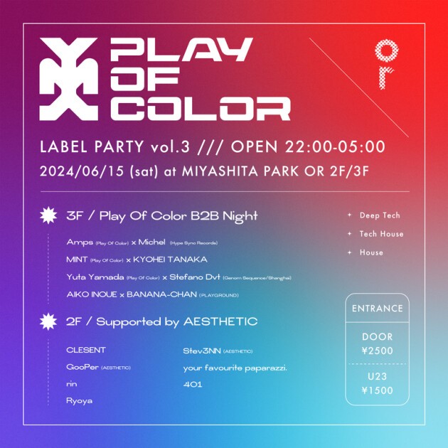 Amps (Play Of Color) × Michel (Hype Sync Records) / MINT (Play Of Color) × KYOHEI TANAKA / Yuta Yamada (Play Of Color) × Stefano Dvt (Genom Sequence/Shanghai) / AIKO INOUE × BANANA-CHAN (PLAYGROUND)