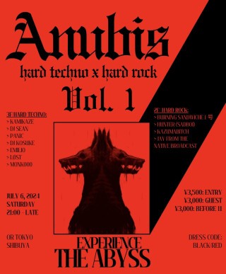 ANUBIS: Experience the Abyss VOL.1 is the debut event of ANUBIS. It will be held on July 6, 2024 at OR Miyashita Park from 9 p.m. Combining hard techno, hard rock, and live art on two separate floors, the event has a fantastic lineup of DJs who are popular in Japan in their respective music scenes.