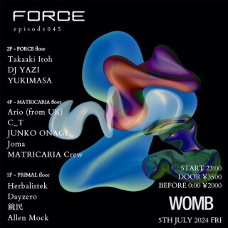 Force, the party that continues to explore electronic and dance music without being bound by conventional concepts, will host its 17th installment on July 5th. This episode promises a lineup that advances multi-dimensional experiences and opens new possibilities for the future. The main floor will showcase leading Japanese techno artists who will demonstrate their transcendent potential without inviting international artists. The 4th floor's VIP floor curated by the outdoor festival Matricaria , offers a philosophy deeply rooted in party culture along with ample playfulness to all attendees. On the 1st floor, the Womb lounge will feature the Primal team, newly managed by Sector, a party known for leading Japan's bass music scene and experimenting with cutting-edge sound design and creation.