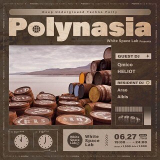 4月のPolynasiaは、ruralやParamount等、数々のテクノ・電子音楽野外フェスティバルへの出演を重ね、浮遊感と疾走感に満ちた、ストーリー性のある没入サウンドを追求し、会場の空気と調和し、有機的なサイケデリック空間を生み出すQmicoと、2015年より大阪のTechnoシーンで活躍し、現在は都内でもDeep Techno DJとして活躍するHELIOTの2名をGuestとして招致。向暑の候、小箱の初夏の夜を洗練されたDeepな4つ打ちで彩る。