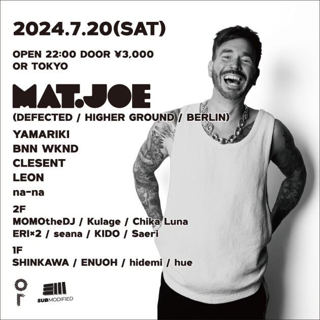 老舗レーベル“Strictly Rhytm”からリリースしたソニー・フォデラとのリミックス「Take It Easy」がBeatport総合チャート1位を記録しメガヒットを樹立。Toolroom、Higher Ground、Dirtybird、Relief、Savedなどのレーベルから数多くの良質な作品をリリースしている。ヨーロッパ直輸入現在進行形のモダンハウスを体現するMat.Joeのプレイを是非体感してほしい。