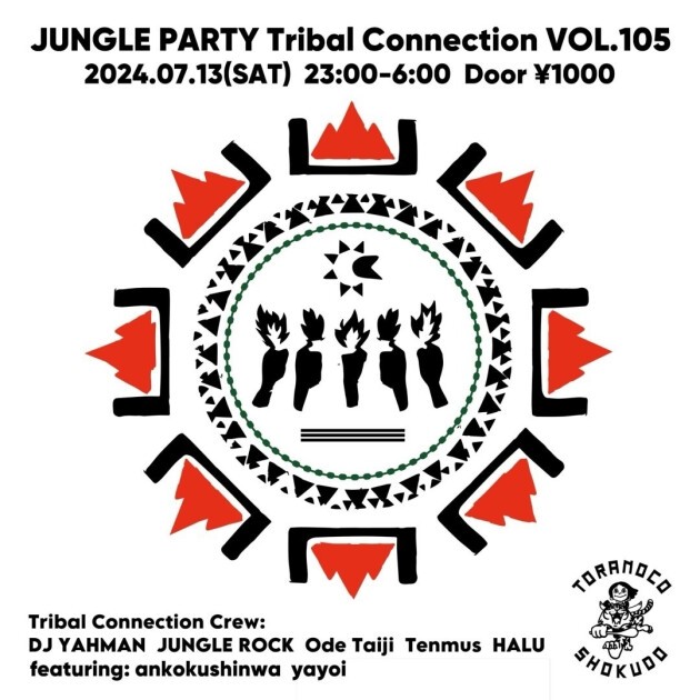2009年に始動したTribal Connectionは、現在、DJ YAHMAN、JUNGLE ROCK、大出泰士、Tenmus、HALUの5人で構成。各自のバックグラウンドを軸に多角的なジャングル活動を行い、JUNGLE PARTY Tribal Connectionを奇数月第2土曜に渋谷の虎子食堂にて開催中。2023年11月の開催通算100回目/創立14周年祭は、開始直後に満員御礼。2024年の秋に創立15周年を迎える。