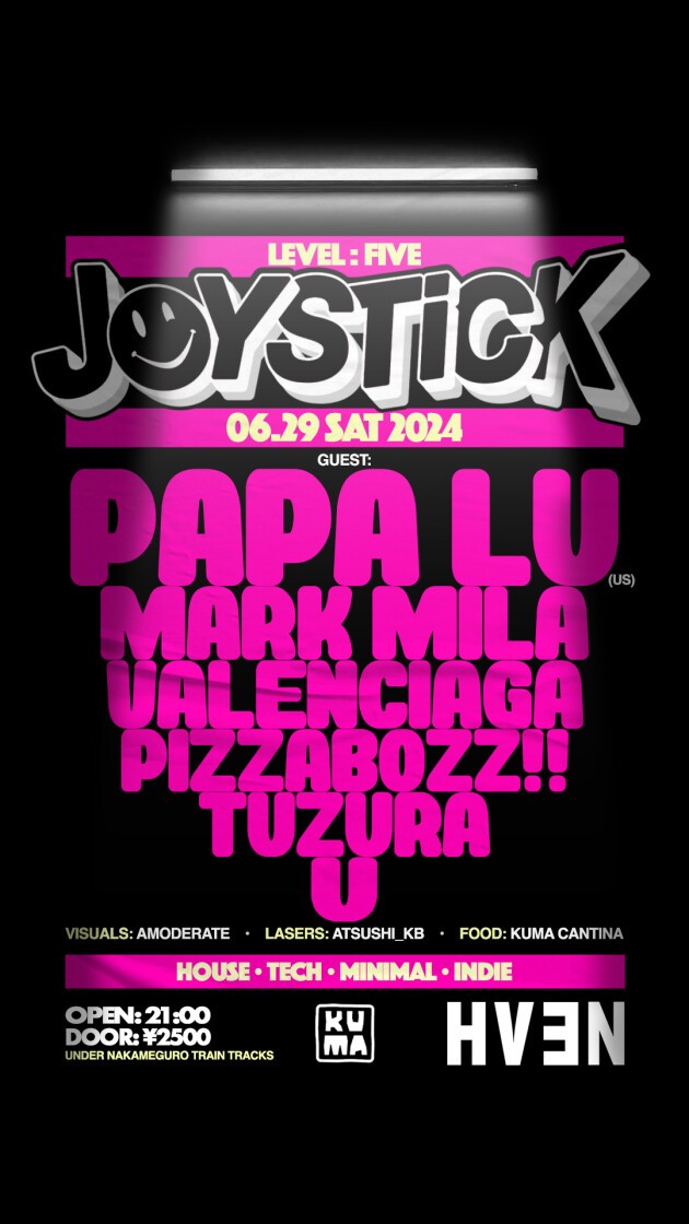 We are back again for LEVEL:05 Saturday 29th of June with special guest PAPA LU and for this one we take Joystick under the train tracks in the Nakameguro neighbourhood to a hot new location, HVEN!