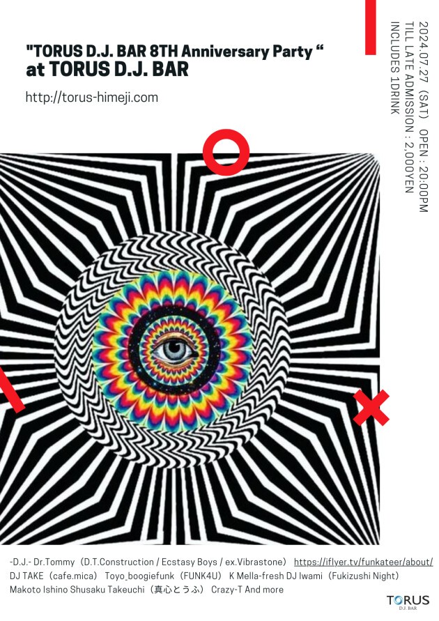 謹啓 皆様には益々ご清祥のこととお慶び申し上げます。 さて、早いものでTORUS D.J.BARが兵庫県姫路市の城下町にオープンしてから今月末で8周年を迎えます。これもひとえに皆様のご愛顧のおかげと、感謝の気持ちでいっぱいです。今後もハイクオリティなサウンドの音楽と供に、美味しいお酒など楽しんでいただけますよう、何卒よろしくお願い申し上げます。つきましては、2024年7月27日(土)に8周年記念Partyを催しますので、万障お差し繰りの上、お立ち寄りくださいますようご案内申し上げます。