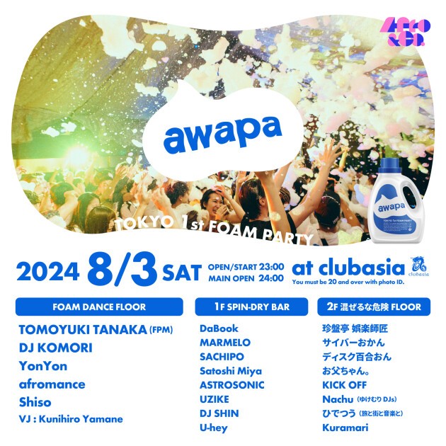 A. メインフロアは泡まみれ&水浸しになるので、Tシャツや水着など、濡れてもよい服装でお越しください(服の下に仕込んでおいて、会場で脱ぐ方が多いようです)。泡に濡れたくない方は、会場の後方やサブフロアであれば泡を避けることができます。また、床は滑りやすくなっていますので、履物はデッキシューズ等をオススメします。
