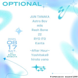 ASTRO BOY主催のOptional。週末開催となる第4回目は、2018年に活動拠点だった大阪から単身渡仏し、独学で学んだDTMで制作したエディットやリミックスが海外の著名DJに賞賛され、海外はもちろん、帰国後幅広いムーブメントで活躍しているJUN TANAKAを招く。