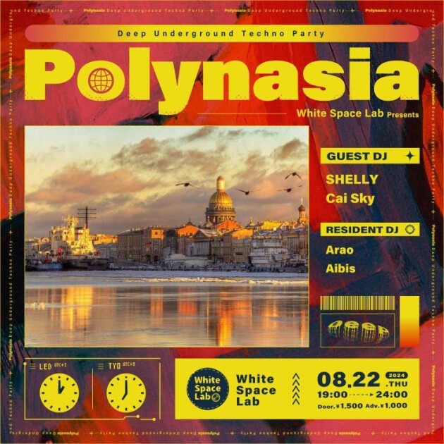 Polynasia in August will feature SHELLY, who started his career as a DJ and organizer in 2022, and hosts the party ``Traffic Jam'' in Tokyo, which has the concept of ``deep and hypnotic nights'' and is always exciting, and Techno. Our guest is Cai Sky, who specializes in mixes that have a story-telling that involves the floor with immersive minimal tracks and deep tracks that exude a love for music, and who hosts "COMFORTABLY NUMB," a new techno party that is conscious of its connection with sound. In the waning days of the summer heat, a variety of techno full of individuality, from Psychedelic to Hypnotic to Deep Minimal, will decorate the night in small club.