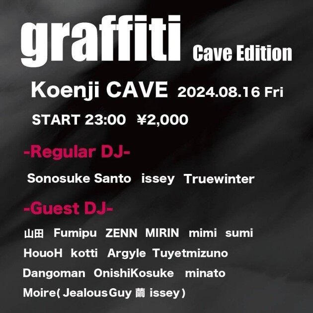 graffiti は東京を拠点とする個性的なDJたちが集まり、自由なアート性を持ったイベントです。奇数月の第二火曜日に頭barにて開催してます。テクノやハウスを中心にしながらも、ジャンルにとらわれずに自由に音楽を楽しむことができます。今回はcave高円寺さんのお誘いで、スペシャルなパーティーを開催します!