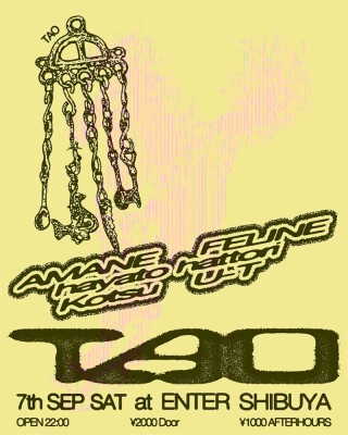 Contactで不定期週末開催していたパーティTAO。場所を変えての開催は6回目。Bamboo主催のU-T、CYKのKotsu、先日ENTERで初主催 鬼の居ぬ間にを大盛況にて収めたFELINE、U.N.I主催のAMANE、クリエイティブクルー L.O.S.Tのメンバーhayato hattoriがラインナップ。1人2時間、たっぷりじっくりディスクジョッキー。乞うご期待。