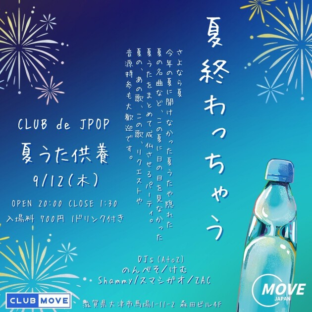 今年の夏に聞けなかった夏うたや隠れた夏の名曲など、この夏に日の目を見なかった夏うたをまとめて成仏させるパーティ。