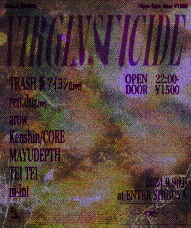 00s生まれのDJコレクティブ/パーティHEADIGのm-intが主催するVirgin Suicide。TRASH 新 アイヨシ、ren.duの2組と、kenshin、arow、MAYUDEPTH、TEITEIの4名のDJがラインナップされた。前回とは打って変わってマシンライブを取り入れた新たな形で第3回目を開催。テクノを取り巻くエレクトロニックミュージックシーンの精鋭を招き入れ、電子音楽が織りなす快楽の境地を覗き込む。