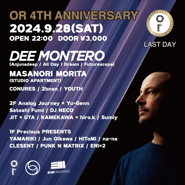 On the last day of the anniversary party, DEE MONTERO will be performing. His work has been released by top labels such as ANJUNADEEP, ALL DAY I DREAM, and STEREO PRODUCTION, and he also founded FUTURESCOPE. He is currently shaping trends in the latest dance music sFrom Japan, the lineup will include MASANORI MORITA, who has had several hits as part of the dance music unit “STUDIO APARTMENT” and who is active as a DJ both in Japan and around the world, as well as the resident DJs of the popular parties ANALOG JOURNEY and Precious, both held at OR.
