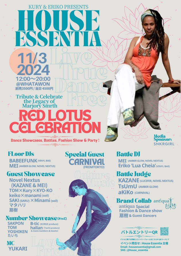 2024 Another Celebration for the Legend Marjory Smarth, a Legend, Pioneer & a True Queen of House Dance. This year we will have Japanese“Sisters” of Marjory CARNIVAL from TOKYO as the Special Main Guest. Also we will welcome KAZANE for the battle judge & performances. Beyond generations, we will Celebrate Her Legacy & share the Love of Dance, Music, Friendship! Inclusive & Welcoming Event we want to build for spreading the “SEEDS” that Marj planted for us. We will have Guest Dance Performances, Dance BATTLEs and Fashion Show & more fun contents lining up! Please join us for this celebration!!