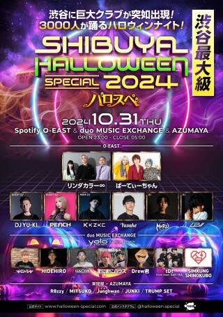 SHIBUYA HALLOWEEN SPECIAL 2024(ハロスぺ)は、豪華ゲスト、国内最高峰のDJを迎えて開催される渋谷最大級のハロウィンイベントです。Spotify O-EAST、duo MUSIC EXCHANGEが、10月31日(木)限定で2,000人超が踊る巨大クラブとして出現。お笑いライブやDJライブ、仮装コンテスト等の豪華コンテンツで、ハロウィンナイトを盛り上げます。