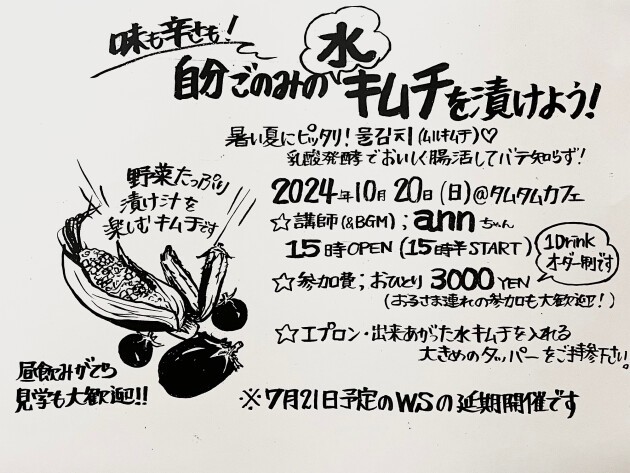 大好評タムタムキムチワークショップ第6弾!7月21日日曜の延期開催分再募集です。今回は1年振りに野菜たっぷり漬け汁を楽しむキムチ、水キムチWSです。野菜もたっぷり使いますが、どちらかと言えばスープ的に頂くキムチです。乳酸菌たっぷりなので、腸活に最適で免疫力も高まり健康と美容にピッタリなんです!参加した事のある皆さんも、興味あるけどやった事が無い皆さんも是非!飲みだけの見学も大歓迎!ご予約は☞ @tamutamucafe まで◎