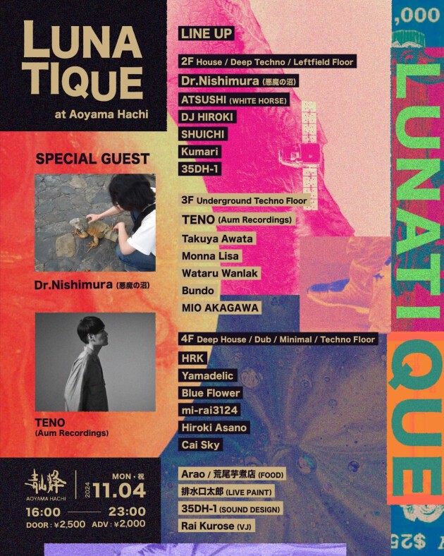 青山蜂で不定期開催しているHouse/Techno Party『LUNATIQUE』は、11/4(土)に3フロアを解放しオリジナル・ラインナップで再び堂々開催!