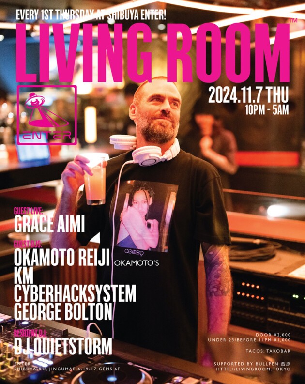 ヒップホップ/ハウス/ジャズに限らず、様々な手法で独自の音楽を提示し続けた真の音楽家であるDJ QUIETSTORM。彼だからこそ為し得ることのできる特別な一夜にはこれまで、平日のパーティにも関わらず様々なジャンルのトップDJ/アーティストだけでなく、これからの音楽を担う若いアーティストを招き、音楽を愛する多くの人々を魅了してきた。 代官山UNICE→渋谷contactを経て、渋谷ENTERではソファーに座ってのDJスタイルではないがダンスフロアー中央にブースが位置する新しいスタイルがLIVING ROOM™のコンセプトにマッチし毎回素敵な空間となっている。