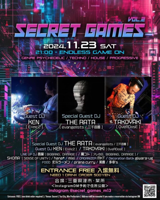 Joining as guest DJs are "KEN" from E=mc2, a group that plays only for pure enjoyment, and "TAKOYAKI," who has been active in RAVEs and known to sweep the crowd into dark, immersive experiences. Expect powerful performances from both.