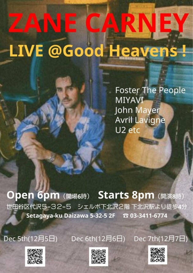 Zane Carney brings his virtuosic guitar prowess and eclectic sound to Tokyo on December 5th-7th at Good Heavens. Doors open at 6pm, show starts at 8pm, and each evening will feature a unique setlist.