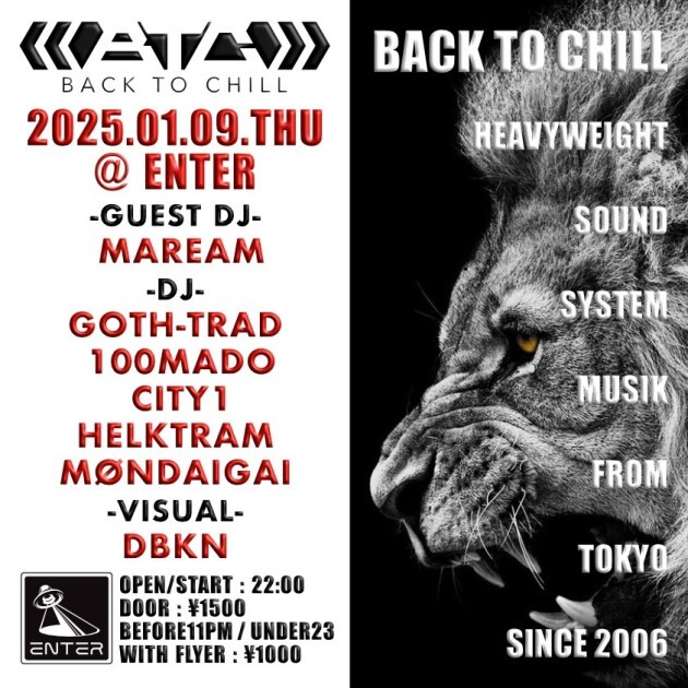 GOTH-TRAD’s party「Back To Chill」, founded in 2006, was Japan’s first regular Dubstep party that led to his connection with the UK Dubstep scene. Not only building a reputation among the heads in Japan, it has gained recognition with Bass Music fans from around the world.This time, BTC have invited BLUETOOF, born in scottland, London-based DJ, producer, and designer who launched the indie record label "Infa Red" in 2022. You should try heavy weight sound that it shakes your body at least once