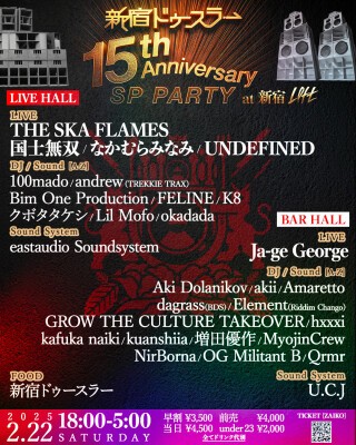 新宿ドゥースラー15周年を記念する特別な夜、新宿LoftのLIVE HALLとBAR HALLを舞台に、若手DJからトップアーティストまで豪華な顔ぶれが集結し、BASSミュージックを中心にジャンルを超えた多彩なサウンドが空間を彩ります。会場には、深みのある低音で伝説を築いてきた eastaudio SOUNDSYSTEM と、山梨から登場する United Culture Japan のサウンドシステムが設置され、圧倒的な音圧が心と体を揺さぶる、他にない音楽体験が待っています。新宿の音楽シーンを支え続けてきたドゥースラーの節目を、情熱的なプレイと揺るぎないBASSラインが生み出す特別な時間と共に祝おう。この一夜限りの熱いバイブスを、ぜひその目と耳で体感してください!