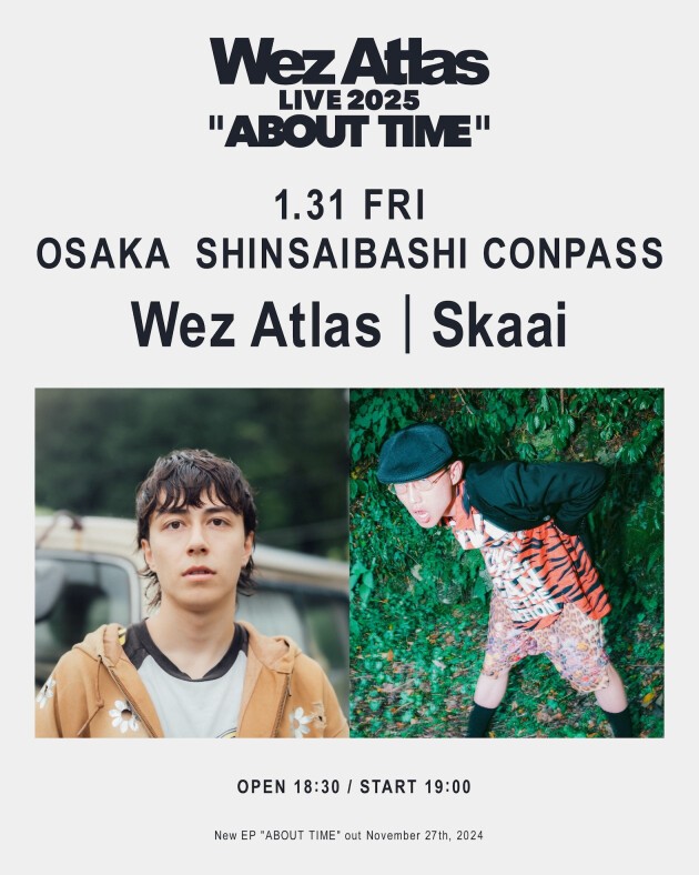 Wez Atlas, the rising hip-hop artist with Japanese and American roots, will hold solo shows in Tokyo and Osaka to celebrate the release of his latest EP, ABOUT TIME. Performing alongside the talented band w.a.u., Wez will bring his energy and flow to the stage for an unforgettable show that bridges cultures and styles. The event kicks off at 19:00.