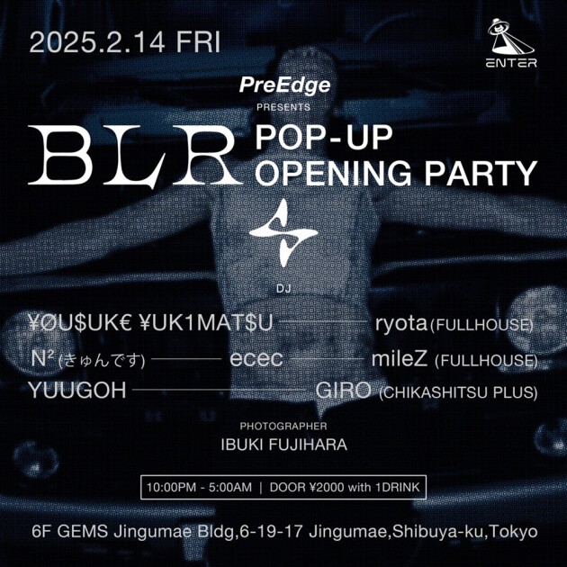 韓国発のブランド BLR のポップアップが2月15日よりCHIKASHITSU PLUSで開催。開催前日にENTERにて、PreEdgeプレゼンツのオープニングパーティを敢行する。
