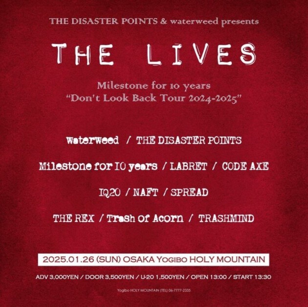 Milestone for 10 years / THE DISASTER POINTS / waterweed / LABRET / CODE AXE / IQ20 / NAFT / SPREAD / THE REX / Trash of Acorn / TRASHMIND
