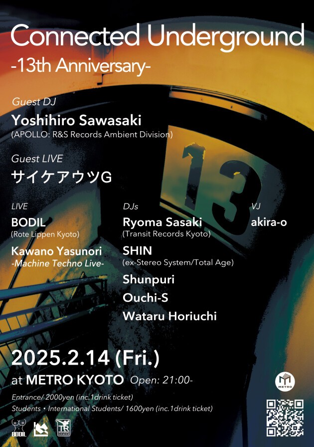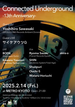 13周年を迎える今回は、1994年、ベルギーの名門レーベル R&S RecordsのAmbient Division である APOLLO からのリリースを皮切りに数々の傑作エレクトロニック・ミュージック作品をリリースし、現在も幅広い分野で活躍する日本を代表するテクノ・オリジネイターである「サワサキヨシヒロ」氏、そして、日本におけるドラムンベース/ジャングルの先駆的存在であり、サンプリングとビート・メイキングの異能、ダンスミュージック・シーンにおける絶対的な存在としてジャンルや世代、国境を超えて支持され続ける「サイケアウツG」という2人のレジェンドをゲストに迎えお送りします!是非、お越しください!