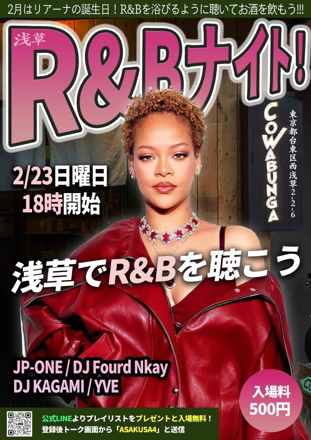 大好評だった浅草R&Bナイトの第四弾を開催します! 地元の人にも親しまれている和のテイスト溢れるスタンディングバーCowabungaにて、2月23日、日曜日の18時開始です。ヒップホップやレゲエも織り交ぜつつ、R&Bを愛する皆様とR&Bを浴びるように聴く会となっております。