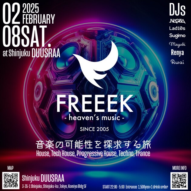 Join us on Sat, Feb 8 at Shinjuku DUUSRAA for FREEEK-heaven’s music-! A night of house, techno, and trance, blending originality and excitement. Let’s share an unforgettable vibe—We are all ONE!!