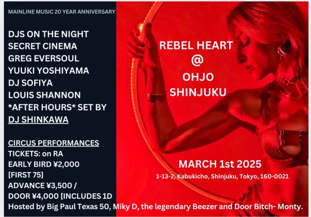 Immerse yourself in a night of cutting-edge electronic music as Mainline Music celebrates 20 years. Headlined by Dutch techno pioneer Secret Cinema (Gem Records) fresh from his iconic Loveland Festival appearances, and San Francisco house legend Greg Eversoul. alongside Special DJ SHINKAWA AFTERHOURS Set for maniac lovers !