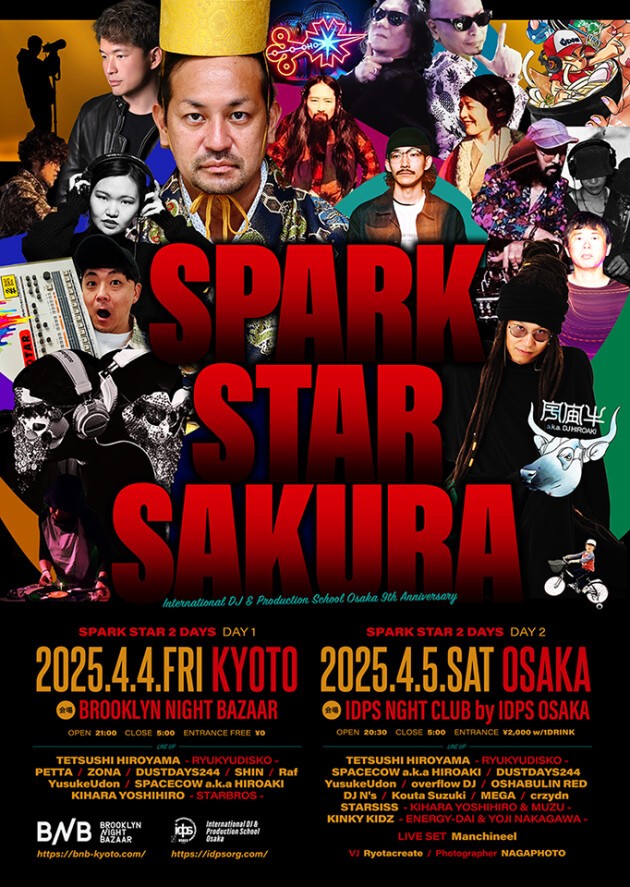 今年の4月で開校9周年を迎える DJ スクール IDPS OSAKA。9周年を祝うアニバーサリーイベントが、4月5日土曜日に沖縄と大阪を結ぶパーティ SPARK STAR を夜20時半からのオールナイト公演で開催決定!
