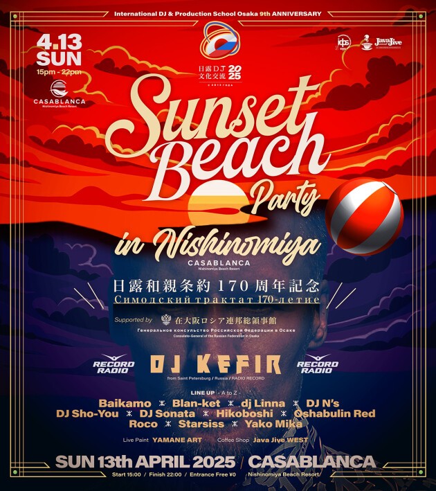 International DJ & Production School Osaka, a DJ school celebrating its 9th anniversary this April, will host the music event ‘Japan-Russia DJ Cultural Exchange 2025 - Sunset Beach Party in Nishinomiya’. The event will be held at Nishinomiya CASABLANCA as a day party from 3pm to 10pm on Sunday 13th April 2025.