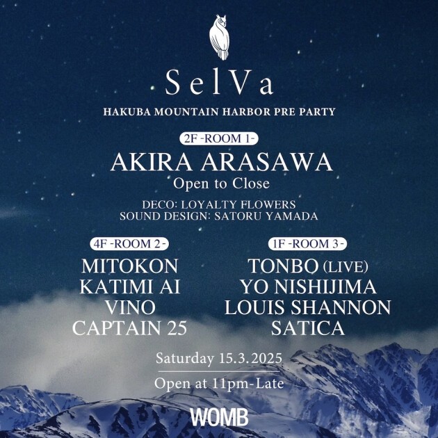 On March 15, SelVa takes over all floors of Womb for an exclusive Pre-Party! Headlining the Main Floor is Akira Arasawa, who is set to perform at Hakuba Mountain Harbor in April, delivering a special Open to Close set.