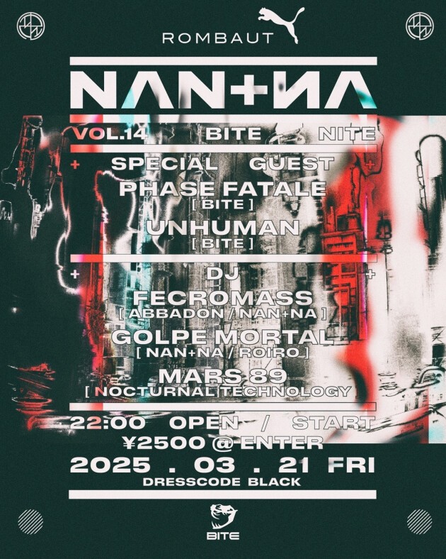独自の音楽性と体験を武器に東京のナイトライフシーンで異彩を放ち続けているNAN+NAの次のイベントは多くの音楽ファンから注目を集める東京・渋谷に位置するクラブ ENTER でベルリンを拠点にEBMとインダストリアルの要素を融合させた唯一無二のサウンドで知られるレーベル〈BITE〉とコラボレーションする。