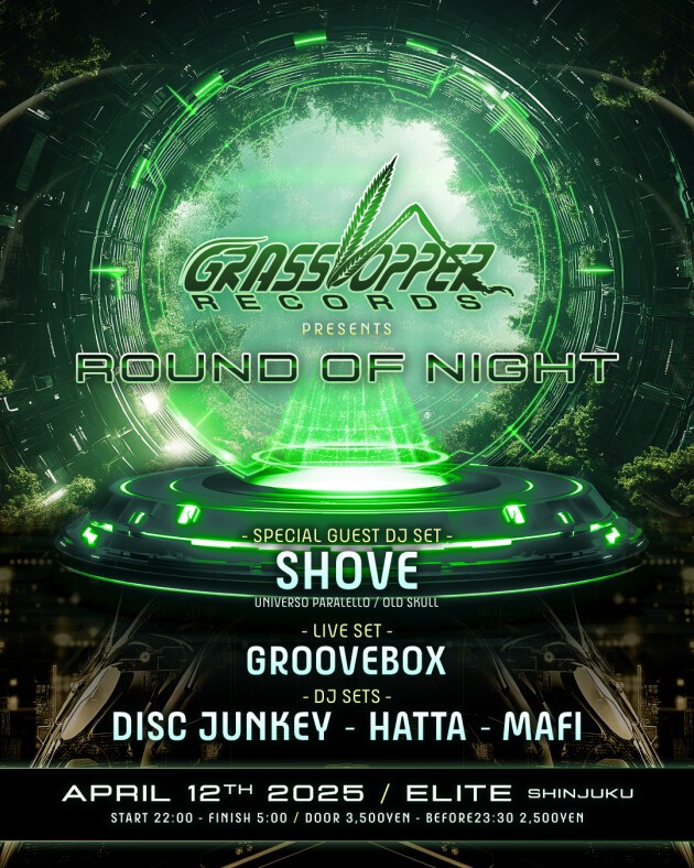 国内トランスレーベル"Grasshopper Records"が2010年より定期開催してきたレーベルパーティー"Round of Night"が再び開催決定!!海外ゲストには古くから交流をもつ"SHOVE"を招致し、舞台は歌舞伎町に位置するEliteにて"シリアスミドルグルーヴ"な一夜をお届けします。