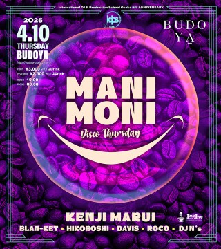 4月10日木曜日は、大阪梅田 BUDOYA にてレギュラー開催中のディスコイベント MANI MONI が、夜19時から深夜0時までのデイパーティ公演で開催!