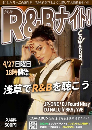 地元の人にも親しまれている和のテイスト溢れるスタンディングバーCowabungaにて、4月27日、日曜日の18時開始です。ヒップホップやレゲエも織り交ぜつつ、R&Bを愛する皆様とR&Bを浴びるように聴く会となっております。お楽しみに!!