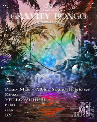 TYO GQOMのK8によるパーティGravity Bongoが2周年を迎えた。 2023年2月より定期的に開催している本パーティは、根幹にあるベースミュージックへの深い愛と民族音楽へのセンサーが鋭敏なDJ陣がラインナップされ、毎度異なるゲストを招きながらも一貫したアティチュードでベースミュージックラバーから支持を得ている。レジデントであるGQOMクルーTYO GQOMのK8を筆頭に、先進気鋭なキュレーションとリリースで、シーンの一角を担うインディペンデントレーベル〈解体新書〉より、主要人物として暗舞するRomy MatsとAlbino Soundが登場。DJとライヴを織り交ぜたハイブリッドセットを披露する。さらに京都をホームに古今東西を駆け抜け、グラフィックデザイナーとしても、DJコレクティヴ CYK のメンバーとしても活躍するKotsu、さらにハウスやジャズを軸に、多様なジャンルを縦横無尽にかけ抜けるオルタナティブパーティFLAT TOPの中心メンバーであるYellowuhuru、レペゼン大阪FULLHOUSEより若手期待の星として各所で活躍するr1ku、issaが出演と、対応力に申し分なしの出演者たちが揃う。