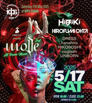 The party will feature two big guests, HiBiKi and Hirofumi Ohta, and will be performed by DRESS, the organizer of this party, and other trance DJs active in the Kansai area.