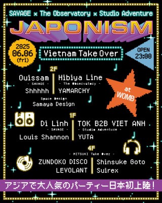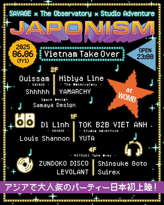For this edition, Japonism joins forces with Vietnam’s two most iconic clubs—Savage in Hanoi and The Observatory in Ho Chi Minh City—as well as leading party collective Studio Adventure. The collaboration spans three unique venues: Dommune (Wed 6/4), Womb (Fri 6/6), and the outdoor gathering Utopia in Nasu (Sat–Sun 6/7–8).