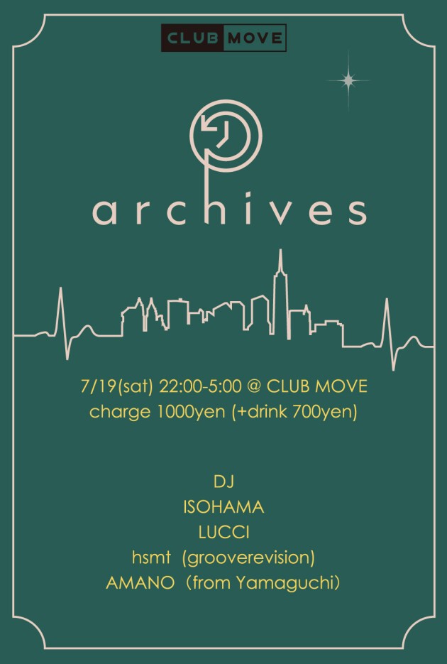“archives” is a gathering of four DJs who met in Kyoto when they were teenagers and are still working as DJs. Nowadays, CLUB MUSIC from the 90's is being reevaluated, so come and experience their GROOVE that ran through that era in real time!